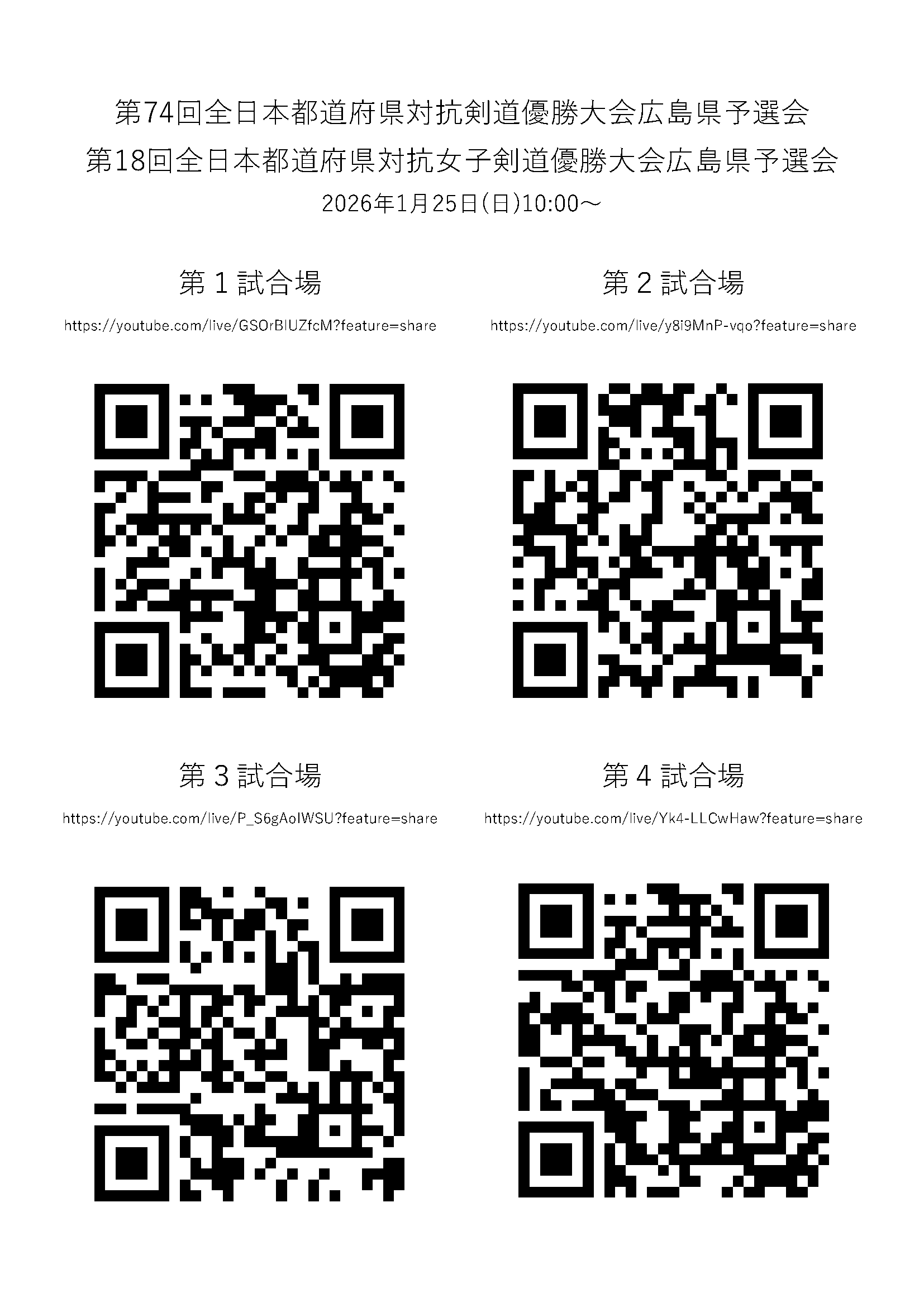 今回の動画配信は、令和8年1月25日(日)広島県立総合体育館武道場において開催されます 第74回全日本都道府県対抗剣道優勝大会広島予選会 第18回全日本都道府県対抗女子剣道優勝大会広島予選会の模様です。 各試合会場の対戦表を参考にご覧ください。 スマートフォンでご覧の方は、下のQRコードを読み取って各試合会場にアクセスしてご覧ください。